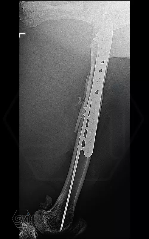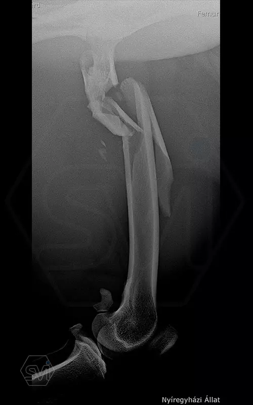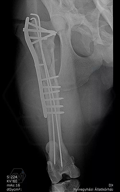 A 9 éves nőstény gepárd törte a lábát ilyen szerencsétlenül a combnyakhoz közel egy átcsoportosítás során. A törés rögzítésére itt is az előző posztban említett velőűrszeg- poliaxiális szögstabil lemez kombinációt alkalmaztuk. A proximális darabba való csavarbehelyezések során igazán jól jött a poliaxialitás, el tudtuk a hosszú csavarokkal kerülni a 2,5 mm-es K szegeket. Remélem elég hosszú lesz a 14 furatos 12*4 mm-es széles poliaxiális lemez (lehetett volna hosszabb…) , amelybe vegyesen 4,0 és 3,5 mm-es csavarok kerültek a minél nagyobb stabilitás eléréséért. Alulról a 6. csavar egy corticalis csavar, amely egy nagyobb ellenoldali fragmentet rögzít húzócsavarként.