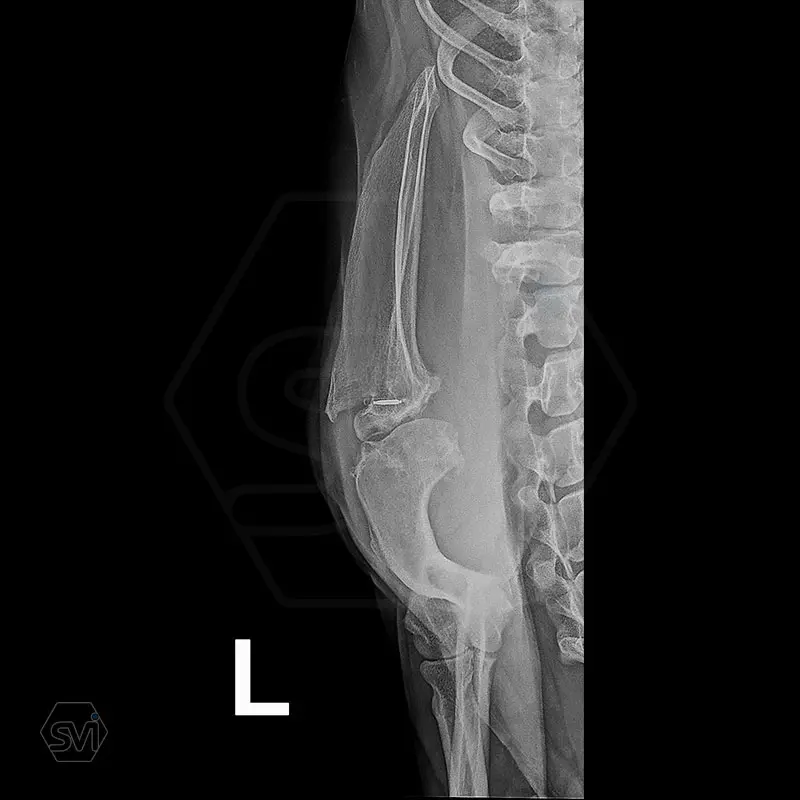 In our case, we created a shoulder arthrodesis on an 11-year-old 16kg female beagle dog with a 2.7 SOP-LC system and 4-4 clamps. The dog developed chronic arthritis and arthrosis, the biopsy did not confirm a tumor, only chronic inflammation.