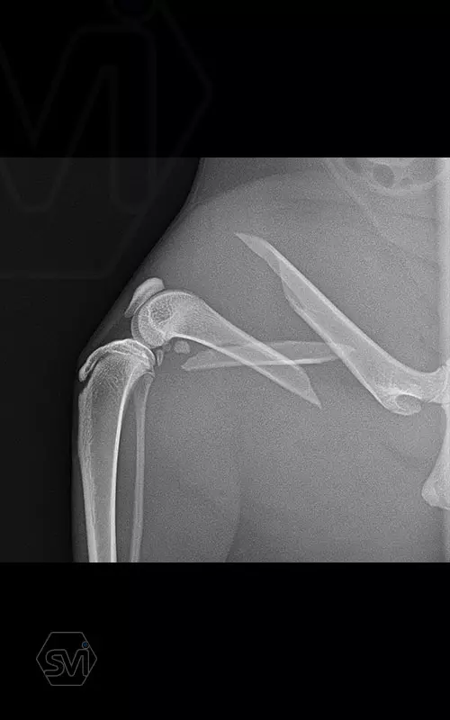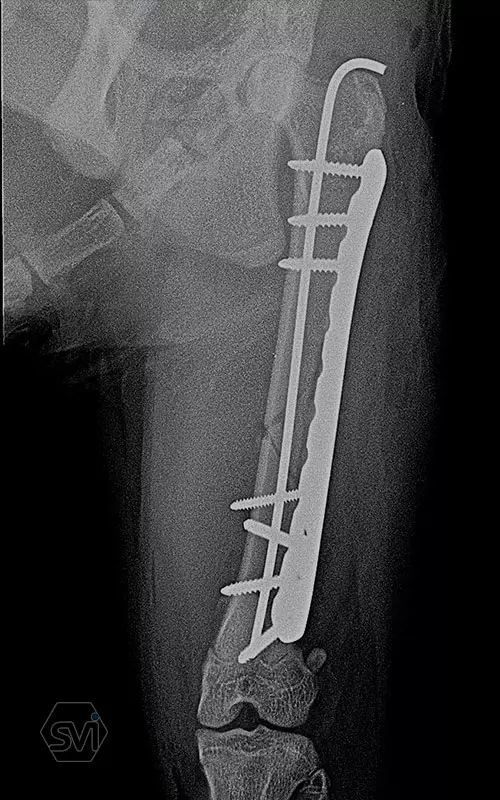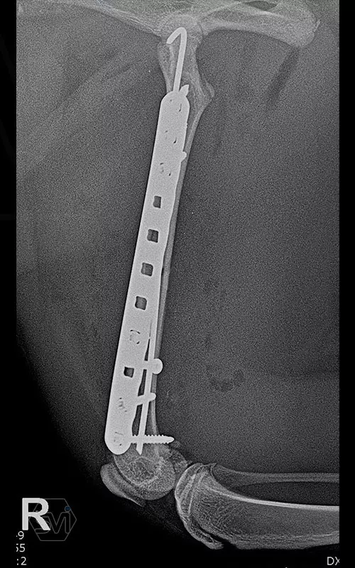 In our case, a middle third fragment fracture of a 10-month-old kitten was treated with a 2.0 polyaxial plate and a combination of 2.0 and 2.4 screws.