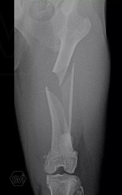 Esetünkben egy 10 hónapos cica középső harmadiszilánkos törését kezeltük 2,0 poliaxiális lemezzel és 2,0 és 2,4 csavarok kombinációjával.