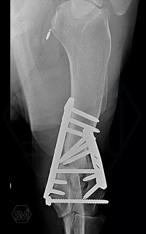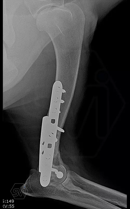 The dog was already using his leg very nicely at control 1 month post op., barely limping. In such a case, the advantages of locking systems (distal short screws are also permanently fastened) and polyaxiality (positioning the screws of the opposing plates so that they do not interfere with each other, and avoiding the screw insertion into the joint or fracture line) are really very helpfull.