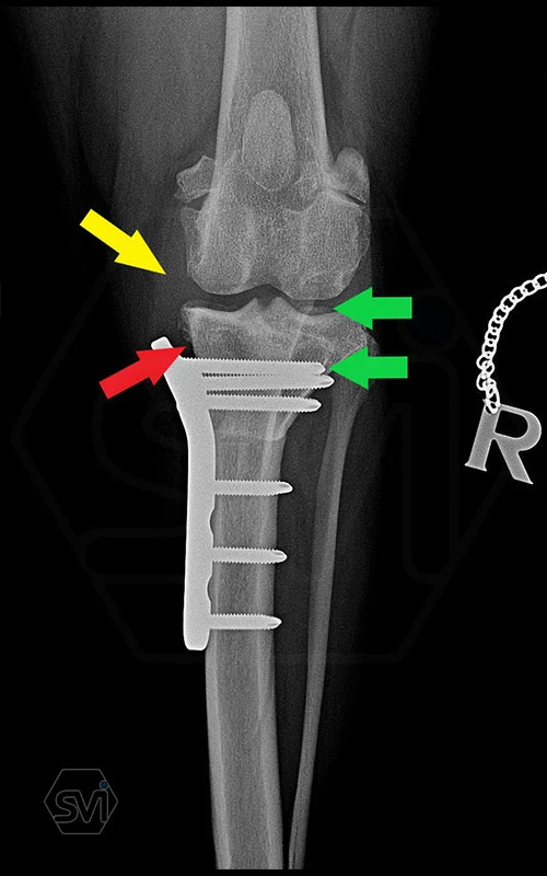 In the picture, the thickend med. collat. lig. marked with a yellow arrow, and the plate follows its shape, marked with a red arrow. The blood circulation in the tissues under the metal is not disturbed, which does not generate further pain and results faster bonehealing.