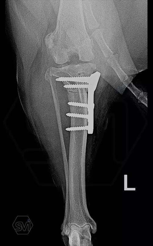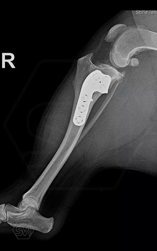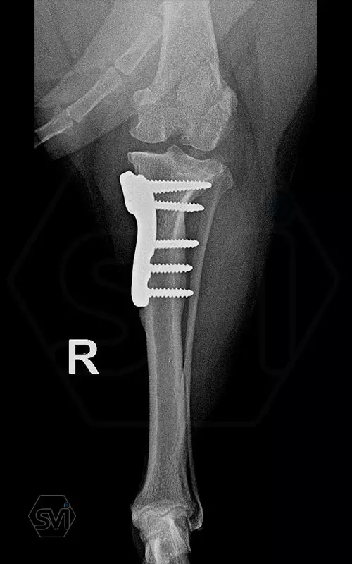 The cranial cruciate ligament rupture of a 7-year-old 8 kg active mix dog was solved a year ago with a precontured polyaxial 2.4mm system, now the other leg has been laid out, and this plate was used here as well. The stability of the system, its fit to the bone and the good healing can be measured nicely on the 1-year control X-ray.