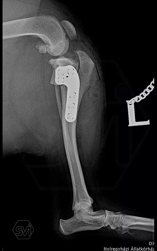 7 éves 8 kg-os aktív keverék kutya elülső kereszteződő szalagszakadástát egy évvel ezelőtt előhajlított poliaxiális 2,4-es rendszerrel oldottuk meg, most a másik lába került terítékre, is itt is ezt a lemezt alkalmaztuk. Az 1 éves kontroll röntgenen szépen le lehet mérni a rendszer stabilitását, csontra való illeszkedését, a jó gyógyulást.