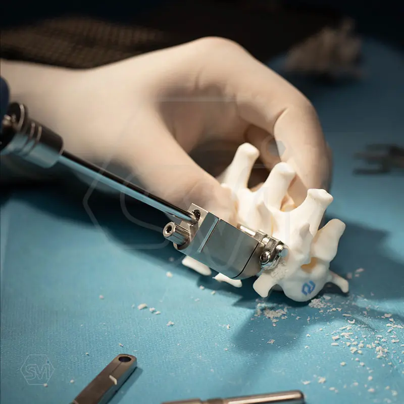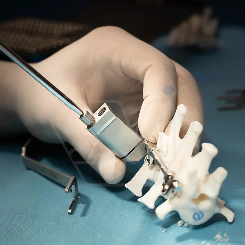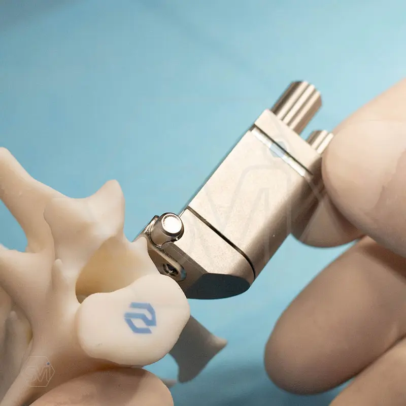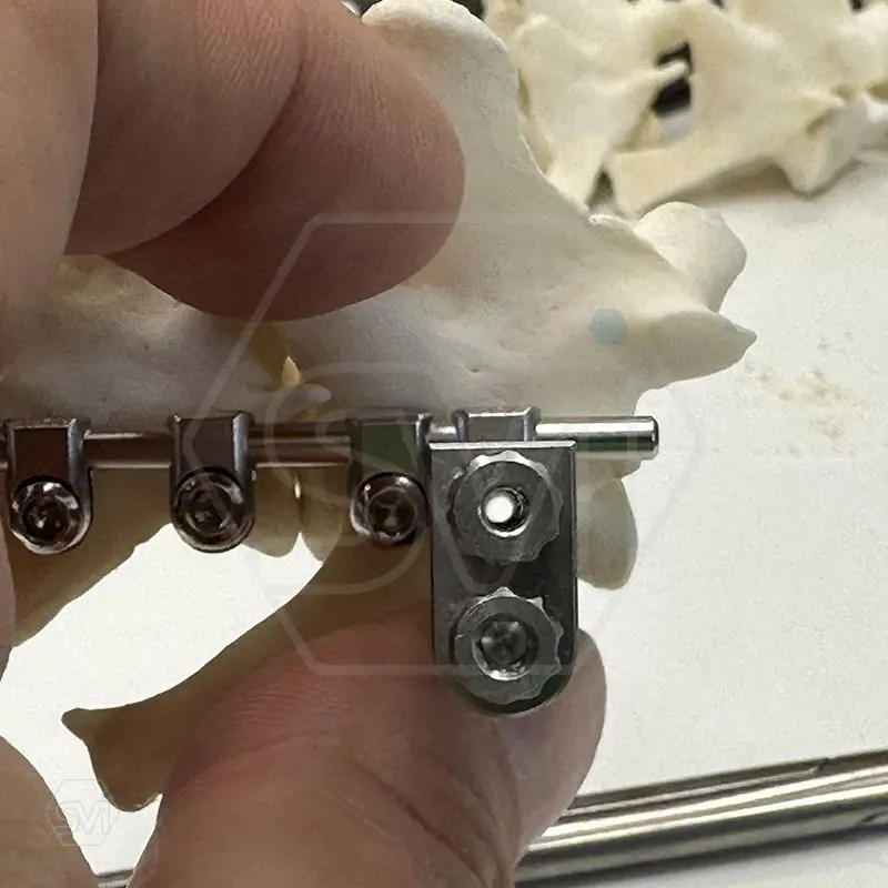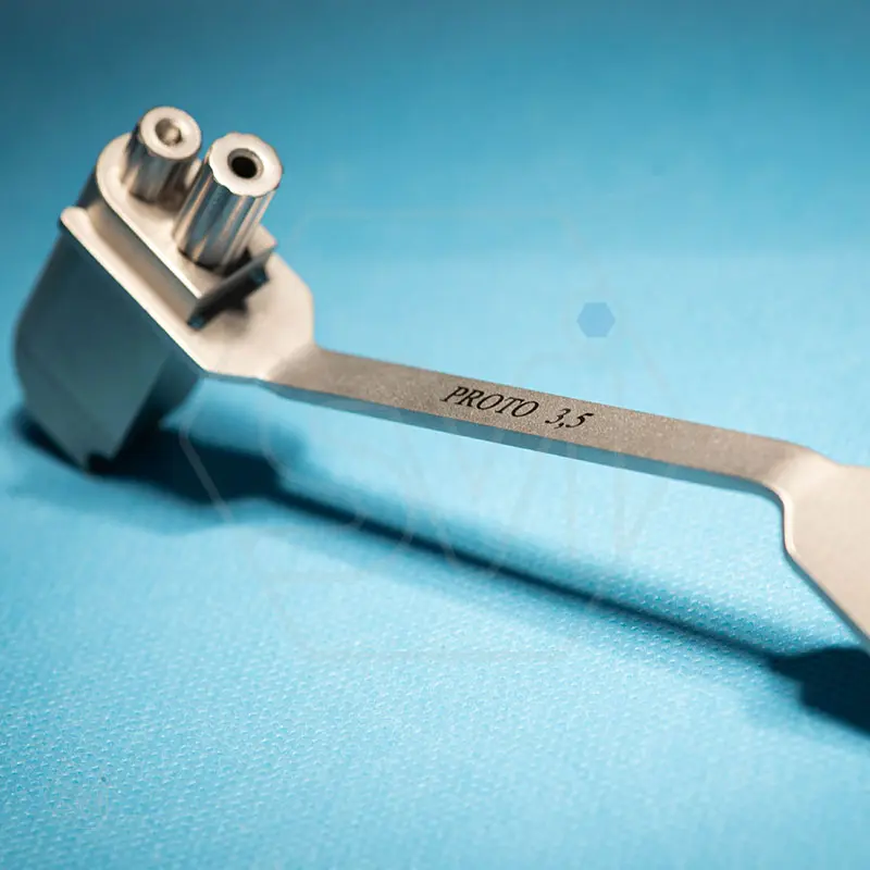 Végre megérkezett az SOP-LC rendszer használatát megkönnyítő eszköz, amely időlegesen rögzíti a bilincset amig a furat elkészül, és a csavar behelyezésre kerül. A szögstabilitás miatt fontos, hogy a bilincs ne mozduljon meg a behelyezés alatt, és a bilincsen lévő menetes furat és a csontban készített fúrási csatorna egy tengelyben maradjon.